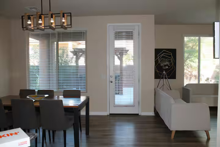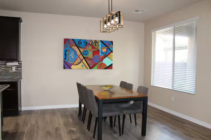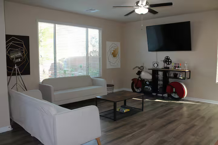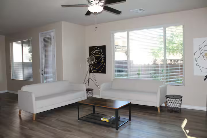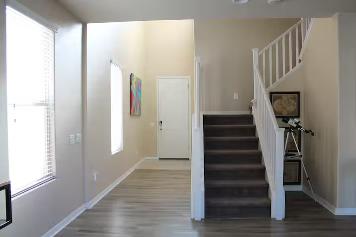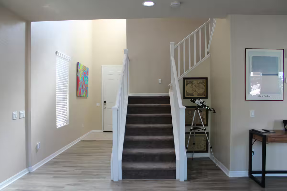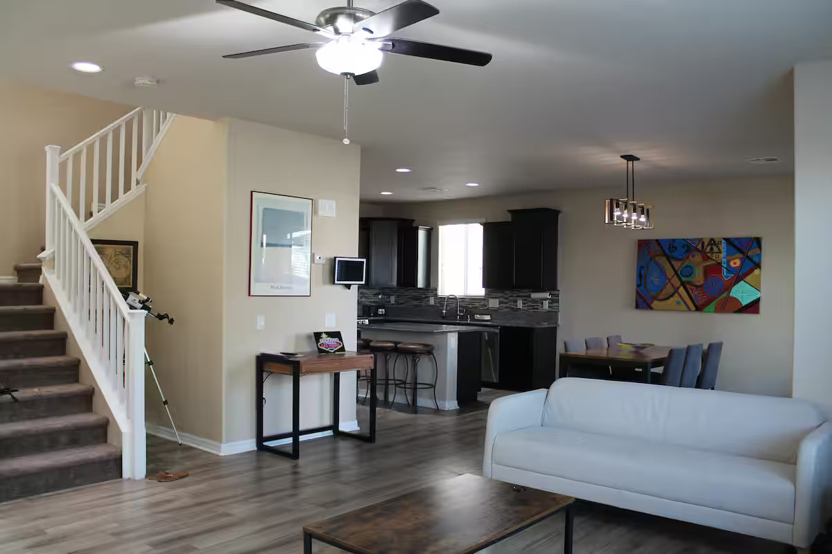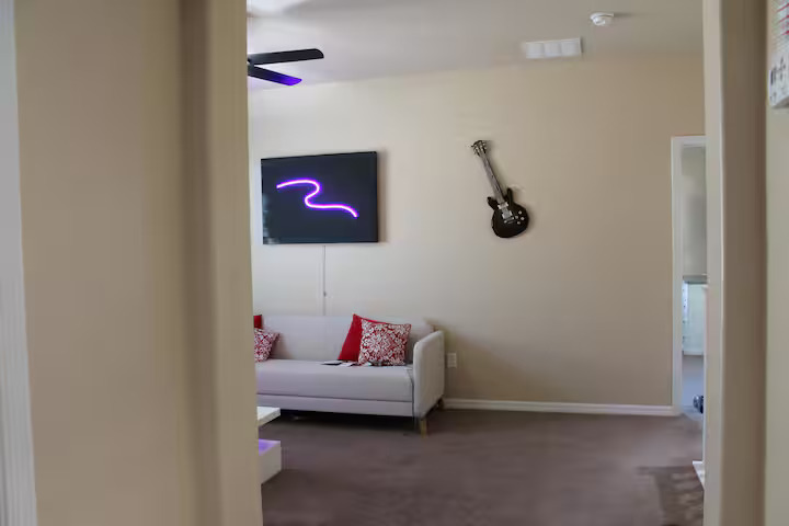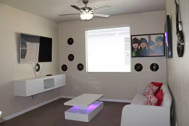Spanning 1,991 square feet, the home is thoughtfully designed for modern living. Each bedroom is equipped with an iPhone charger, Alexa, and an Amazon Firestick, allowing you to easily play news, music, or enjoy entertainment. The living room includes a 15-inch Echo Show and a 75-inch smart TV with access to popular streaming platforms like Hulu, Disney+, Netflix, Apple TV, and Paramount+. Additionally, the loft area is designed with a vibrant neon-lit vibe, creating a fun and energetic atmosphere.