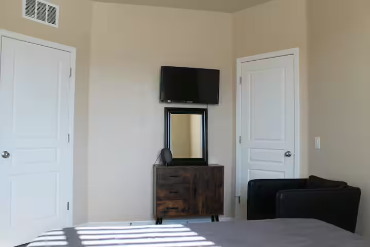 Las habitaciones son cálidas y confortables, ideales para el descanso. La decoración incluye arte rústico, con cuadros abstractos de artistas locales que añaden un toque único y auténtico.